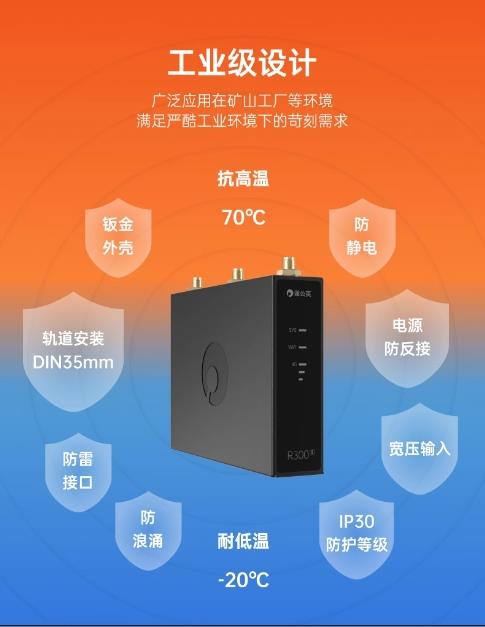 在农业环境下,避免不了长期暴露在风吹日晒中的情况,用于户外场景的硬件应具备高防护性的设计,能够抵御恶劣天气和环境条件。蒲公英R300系列路由器作为工业级别硬件,外壳由钣金材质所打造,保障稳定性和防护性,有助于散热。同时支持轨道安装,提供 5-36V 宽压输入,采用 IP30 防护等级,可广泛应用在户外场所,即时在恶劣天气环境下,也能保障组网设备的稳定传输。